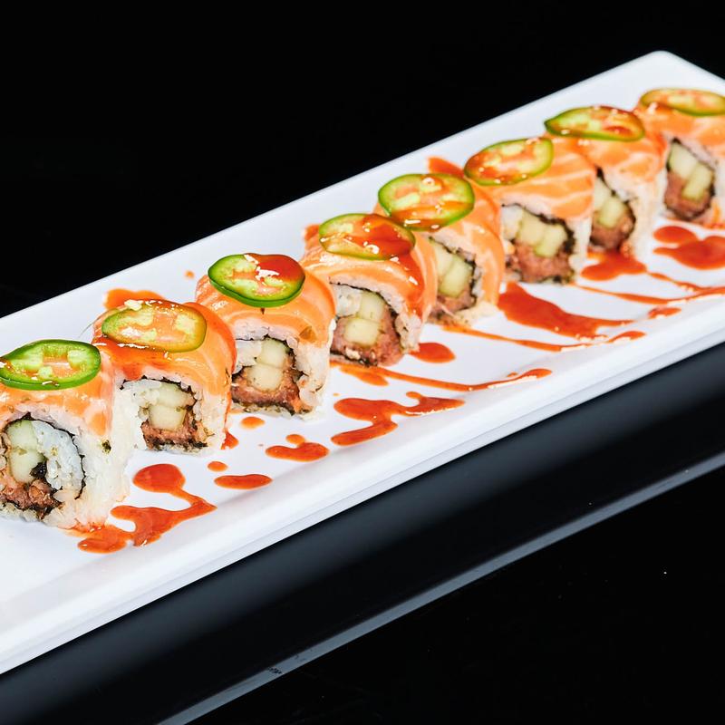 Spicy tuna roll, topped with fresh salmon, jalapeno, and spicy sauce on top