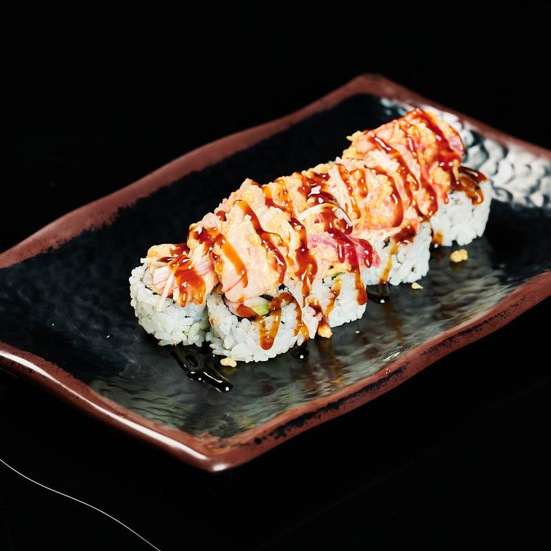 Salmon, spicy crab roll, topped with avocado, tuna, and spicy mayo