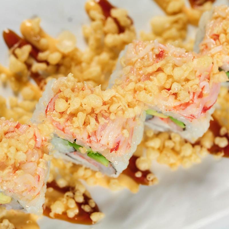 Crab meat, avocado, cucumber, topped with crab stick spicy masago, eel sauce and fried onion