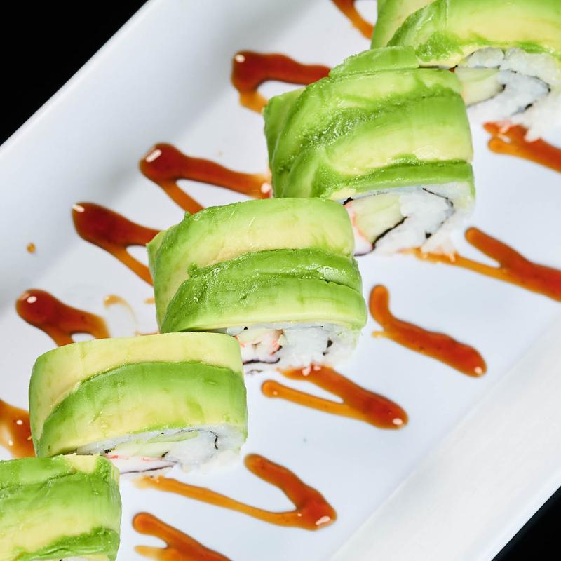California roll topped with avocado and eel sauce on top